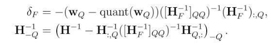 Another challenge of this OBQ method is that the whole process of picking layer by layer and then quantizing and updating the weights is a very compute heavy process. To avoid such high computation, the QBQ process uses an optimisation to calculate the new hessians as shown below.